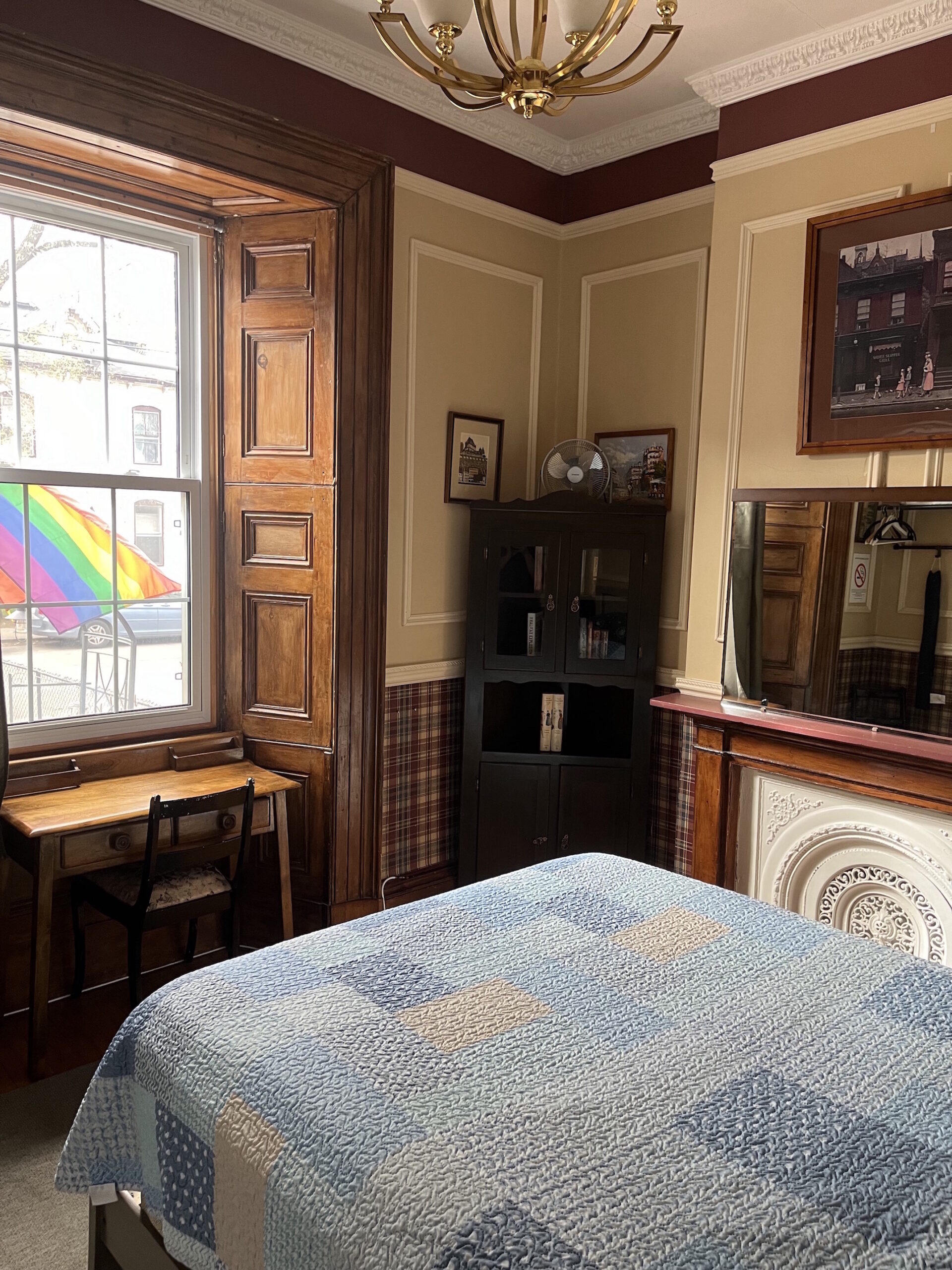 The first is the Beasley Room, located on the ground floor. This bedroom contains a double bed and a desk and overlooks our front garden.