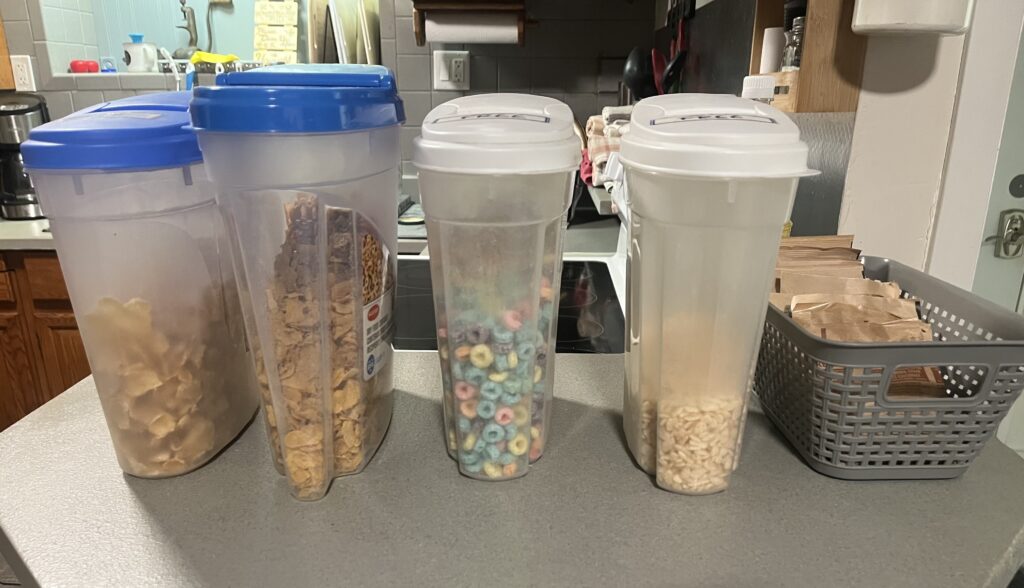 If you want to prepare your own breakfast, we provide dry cereal – four different types, which vary depending on the mood of the person doing the grocery shopping. In the fridge you will find milk – dairy, as well as a few types of non-dairy. We generally have oatmeal packages, and occasionally baked goods. And we also have the essential tools, like frying pans, pots and a toaster.